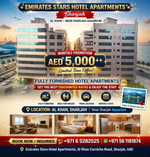 Emirates Stars Hotel Apartments is an ideal choice for travellers looking for Family Serviced Apartments and a comfortable stay near the waterfront. This property is just a 2-minute walk from the beach and is perfectly located on Corniche Road, offering spacious apartments with kitchenettes and partial sea views, well suited for families and long stays. Sharjah International Airport is only a 20-minute drive away. All airconditioned rooms and apartments are designed for comfort and convenience, featuring large windows with blackout curtains, a TV with multilingual channels, and en-suite bathrooms complete with bathrobes and slippers. Located at Al Khan Lagoons, directly opposite Sharjah Aquarium on Corniche Road, the hotel enjoys a prime and accessible location. Dubai’s Gold Souk is just 2.5 km away, making day trips easy for guests. With Al Khan being a preferred area for travellers interested in museums, relaxation, and budget-friendly travel, Emirates Stars Hotel Apartments stands out as a reliable option for families and visitors seeking the Best Hotel Apartment in Sharjah.